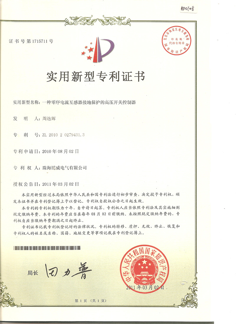 (实用新型)一种零序电流互感器接地保护的高压开关控制器